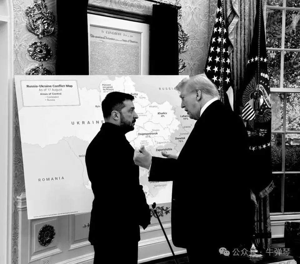 但人们看到,白宫房间里,竖起了一个巨大的乌克兰形势图,上面标明了俄罗斯占领区,特朗普和泽连斯基驻足观看。