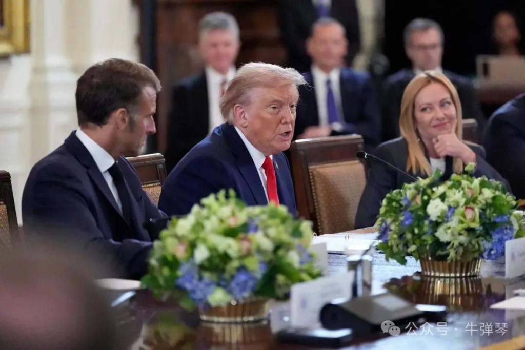 看长条桌座次,特朗普居中,左边是意大利总理梅洛尼,右边是法国总统马克龙,再边上,则是德国总理默茨和英国首相斯塔默。