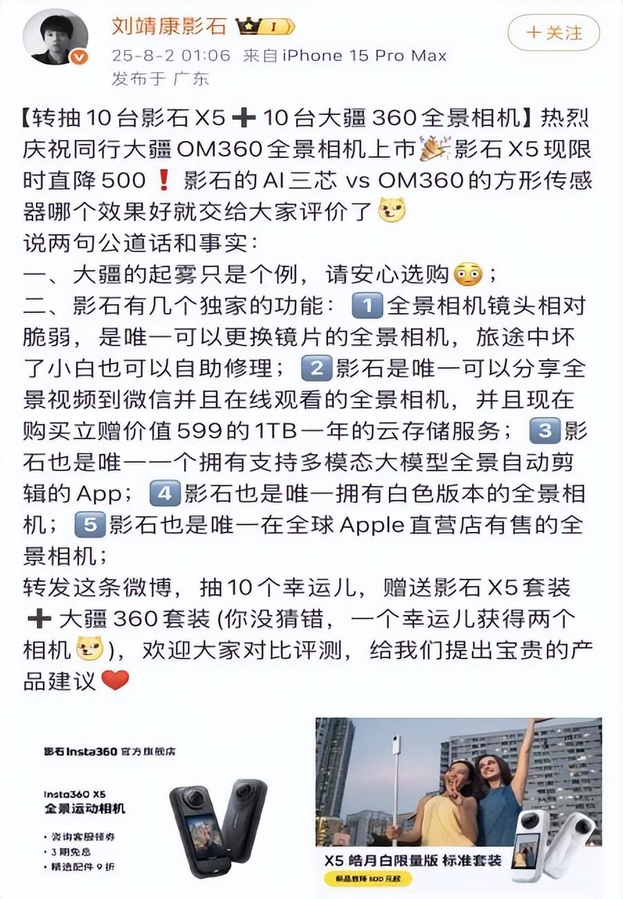 影石的反击迅速、高调。就在大疆新品发布次日的凌晨,影石 CEO 刘靖康便在个人微博上发文,一面大度地向 " 新玩家 " 大疆表示 " 祝贺 ",为大疆的起雾问题做了解释,一面话锋一转,表达 " 欢迎竞争,让市场更繁荣 " 的态度,并宣布将自家的王牌新品 Insta360X5 降价 500 元,同时带着 " 不怕比 " 的态度,将 Osmo360 和影石 X5 一起加入了抽奖组合。