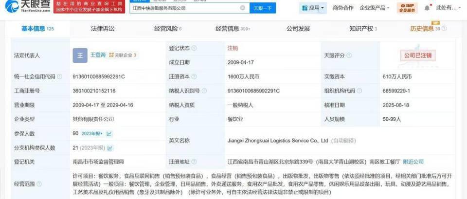 近日," 鼠头鸭脖 " 事件关联公司江西中快后勤服务有限公司企业状态由存续变更为注销,今年 6 月,该公司已发布注销备案公告,注销原因为决议解散。