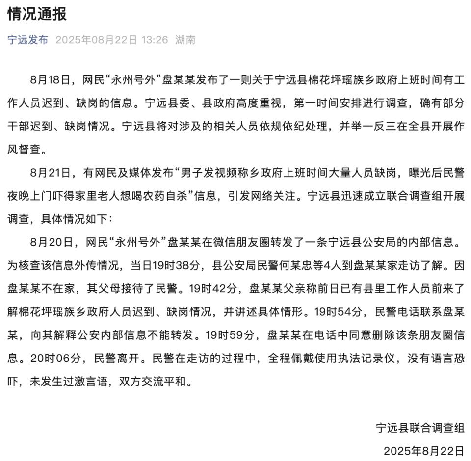8 月 22 日,宁远县联合调查组就" 民警找曝光者谈话家中老人被吓轻生 "一事发布情况通报。