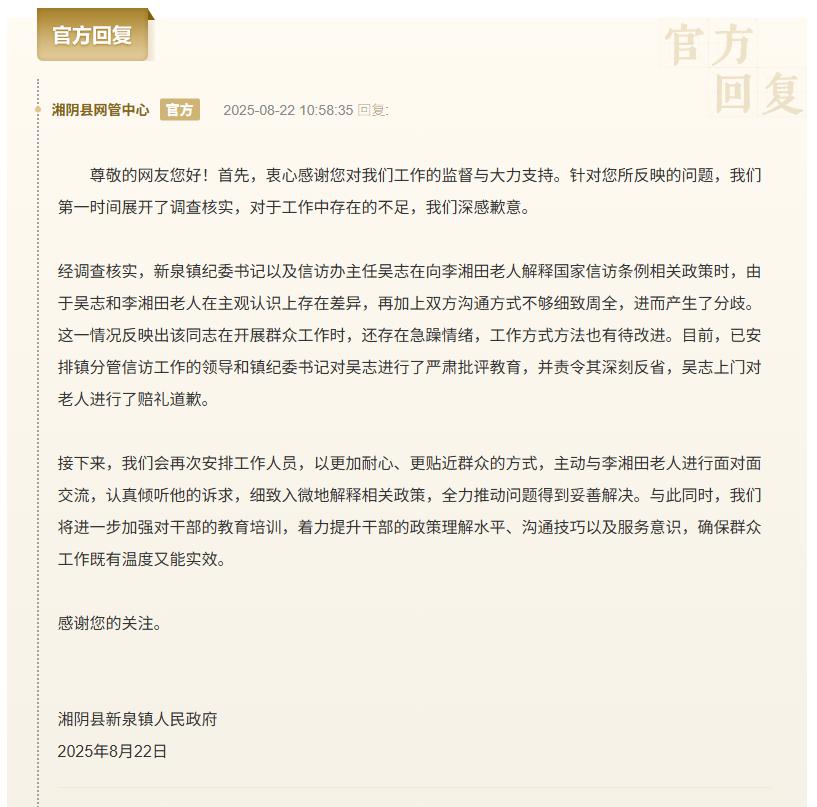 8 月 22 日,湘阴县新泉镇人民政府回应称:“针对您所反映的问题,我们第一时间展开了调查核实。经调查核实,新泉镇纪委书记以及信访办主任吴某在向李某某老人解释国家信访条例相关政策时,由于吴某和李某某老人在主观认识上存在差异,再加上双方沟通方式不够细致周全,进而产生了分歧。这一情况反映出该同志在开展群众工作时,还存在急躁情绪,工作方式方法也有待改进。