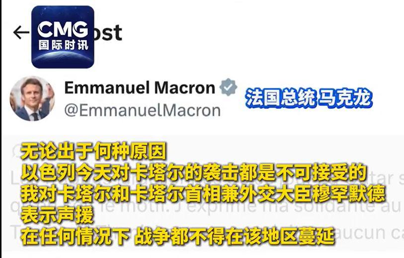 法国总统马克龙在社交平台发帖称,以色列对卡塔尔的袭击无论出于何种原因都是不可接受的。