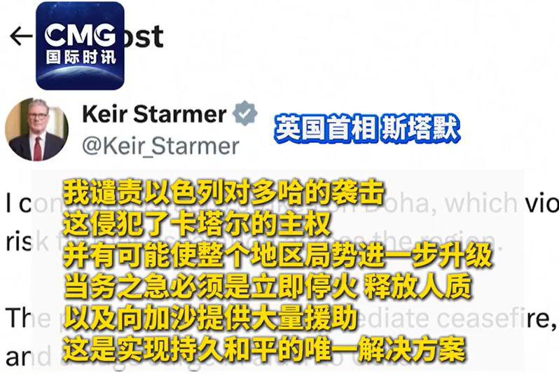 英国首相斯塔默谴责以色列对卡塔尔多哈的袭击,称其侵犯了卡塔尔的主权,并有可能导致整个地区局势进一步升级。