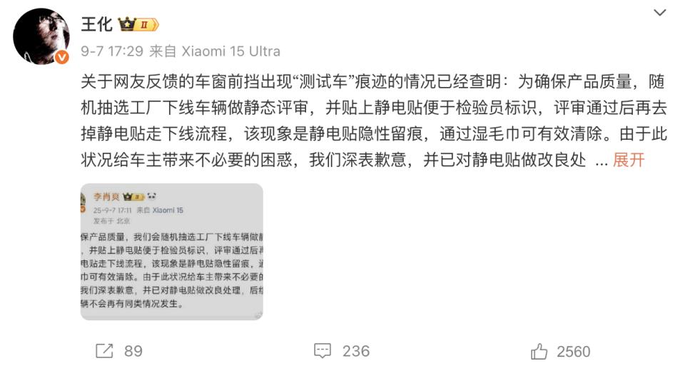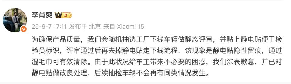随着事件在网络上迅速发酵,9 月 7 日,李肖爽和小米公关负责人王化在社交平台公开回应此事,并向车主致歉,称 " 已对静电贴做改良处理 "。(详见《提车半个月,发现竟是测试车?小米 YU7 车主维权丨车界》)