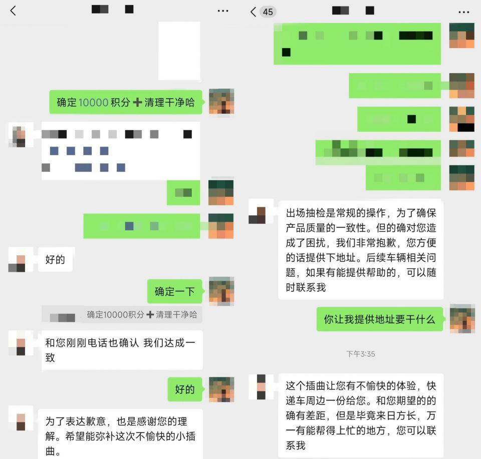 9 月 6 日(左)售后人员承诺给当事车主提供积分补偿,9 月 8 日(右)该售后人员不再提积分补偿,提出给当事车主车周边。受访者供图