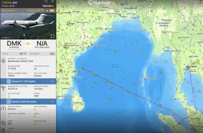 据航班跟踪网站 Flightradar24 的信息,当地时间晚上 7 时 17 分,这架飞机从曼谷起飞,越过泰国湾,穿过马来西亚上空。然而,飞机没有如预期般在飞行两小时后在新加坡降落,而是突然调转方向朝西飞去,并在印度洋安达曼海上盘旋了两圈。随后,飞机朝迪拜方向飞去。