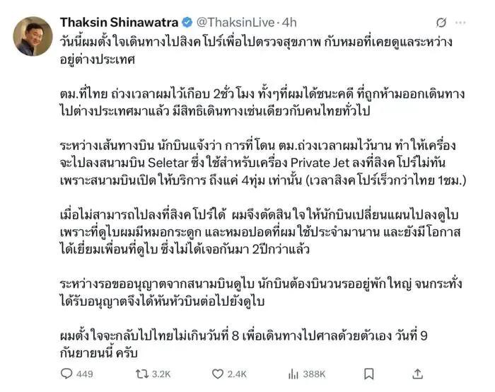 这个说法站不住脚。因为他没有必要,也从来没有提前宣布过自己需要定期到新加坡看医生——医生嘛,泰国又不是没有,在阿努廷上台的前一天突发奇想跑出国看病,这显然很不正常,会给外界以跑路的联想,非常不利于他信的人设构建。别说没必要出国,就算真的病了,真的必须去新加坡才能找郎中,也要往后推一推,等过了这段日子再说。