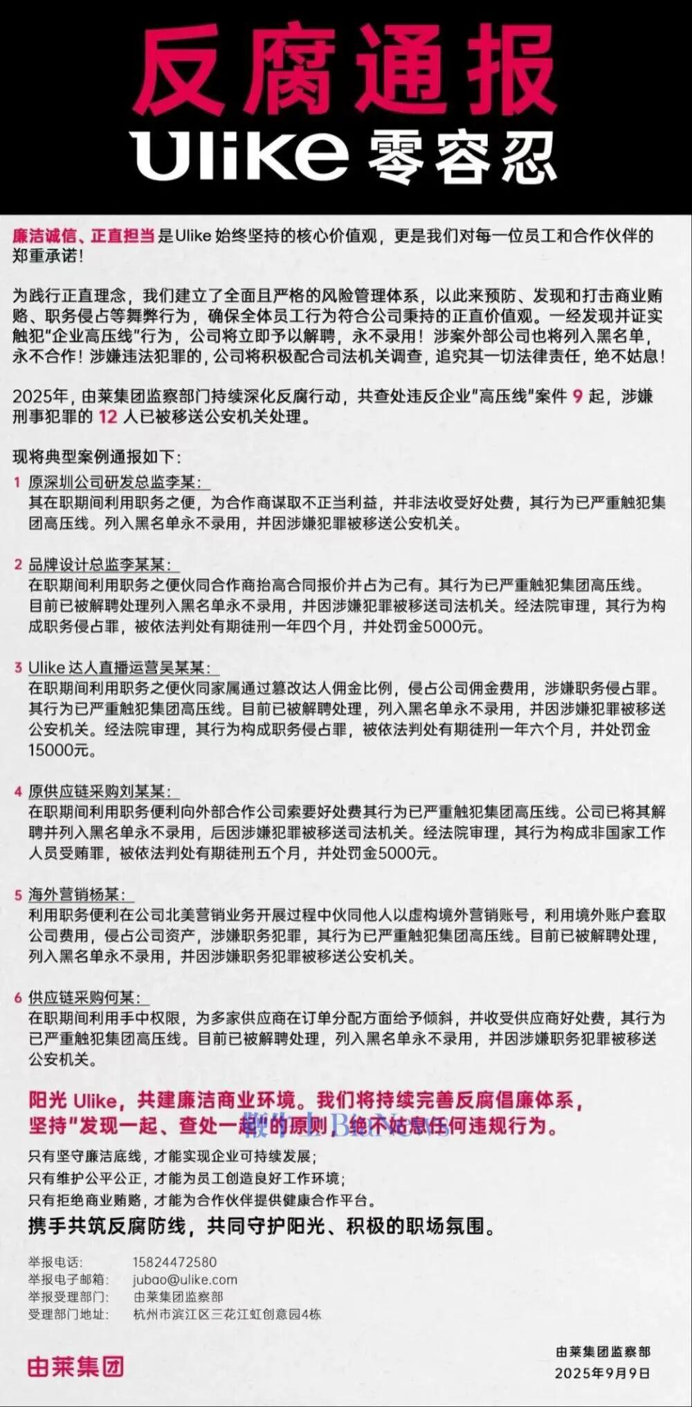 9 月 10 日消息,鞭牛士获悉,Ulike 母公司由莱集团日前发布了内部反腐通报,披露 2025 年员工违规处理情况。