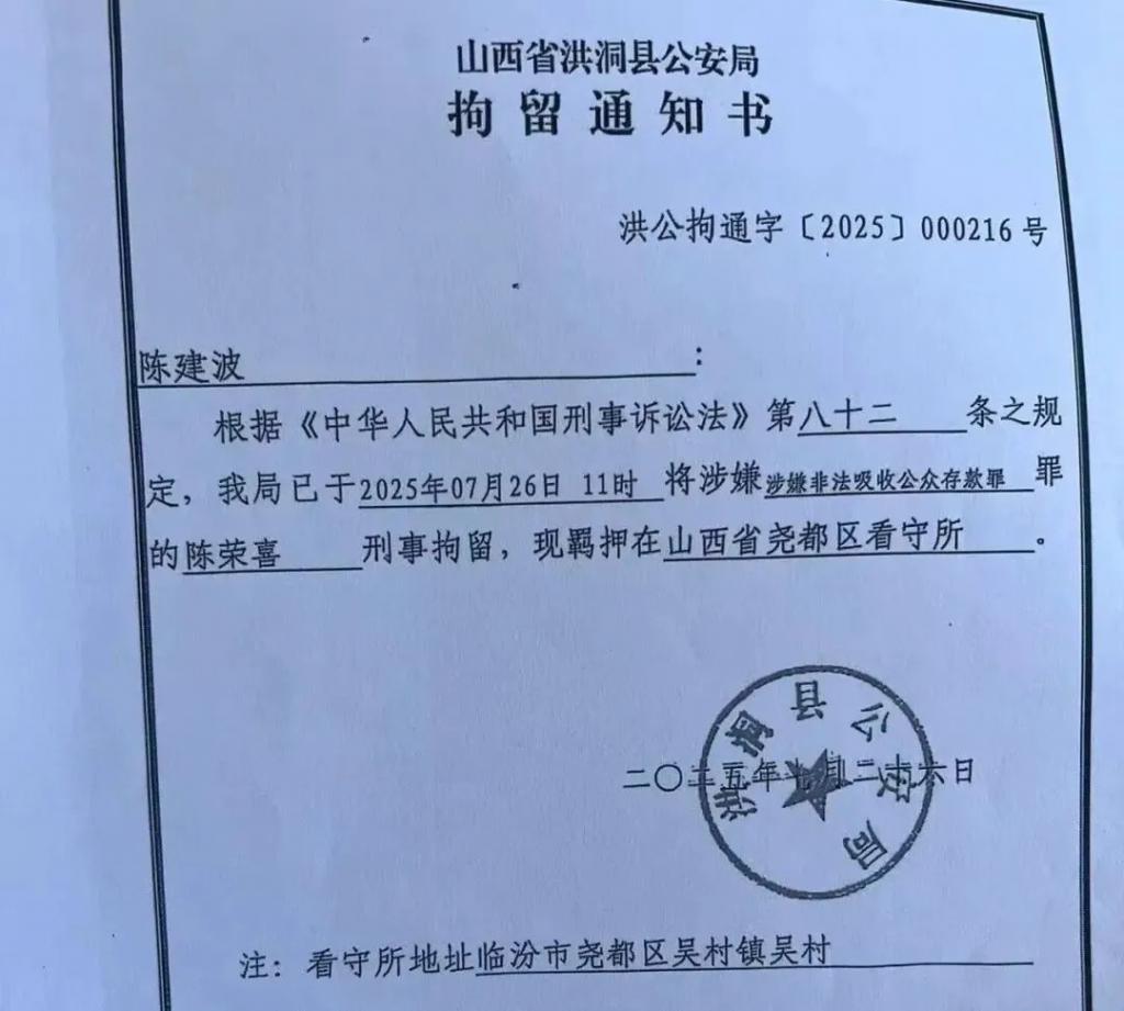 但他没法上台领奖。早在7月26日,陈荣喜因涉嫌非法吸收公众存款罪,被山西省洪洞县公安部门刑拘。