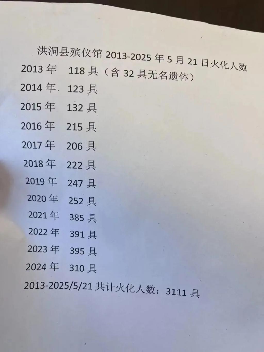 而根据洪洞县统计局数据测算,2013—2024年(2020年数据缺失),洪洞年均死亡4490人,火化率仅5.7%。