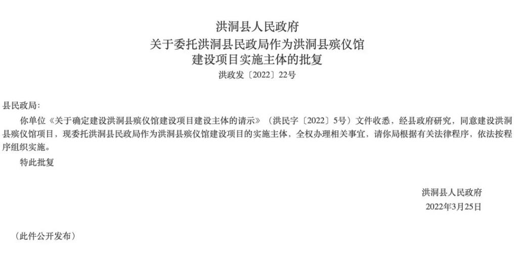 2022年3月25日,洪洞县人民政府发布关于洪洞县殡仪馆建设项目实施主体的批复 / 图源:临汾市政府网
