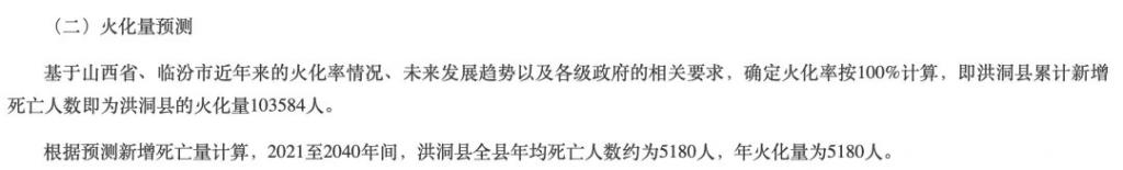 2022年4月8日,洪洞县民政局发布关于《洪洞县城乡殡葬基础设施布点专项规划(2021-2035年)》的公示中提及火化量预测 / 图源:临汾政府网
