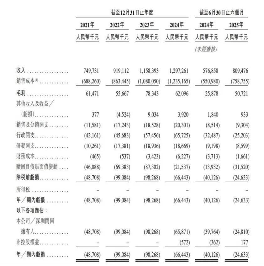 招股书透露了闪回科技如今的业绩境况。一方面,2021 年到 2024 年,其营收从 7.50 亿元增长到 12.97 亿元,2025 年上半年营收为 8.09 亿元,同比增速超过 40%,扩张势头强劲;另一方面,从 2021 年到 2024 年,其亏损分别为 4870.8 万元,9908.4 万元、9826.8 万元、6644.3 万元,至今未能实现盈利。