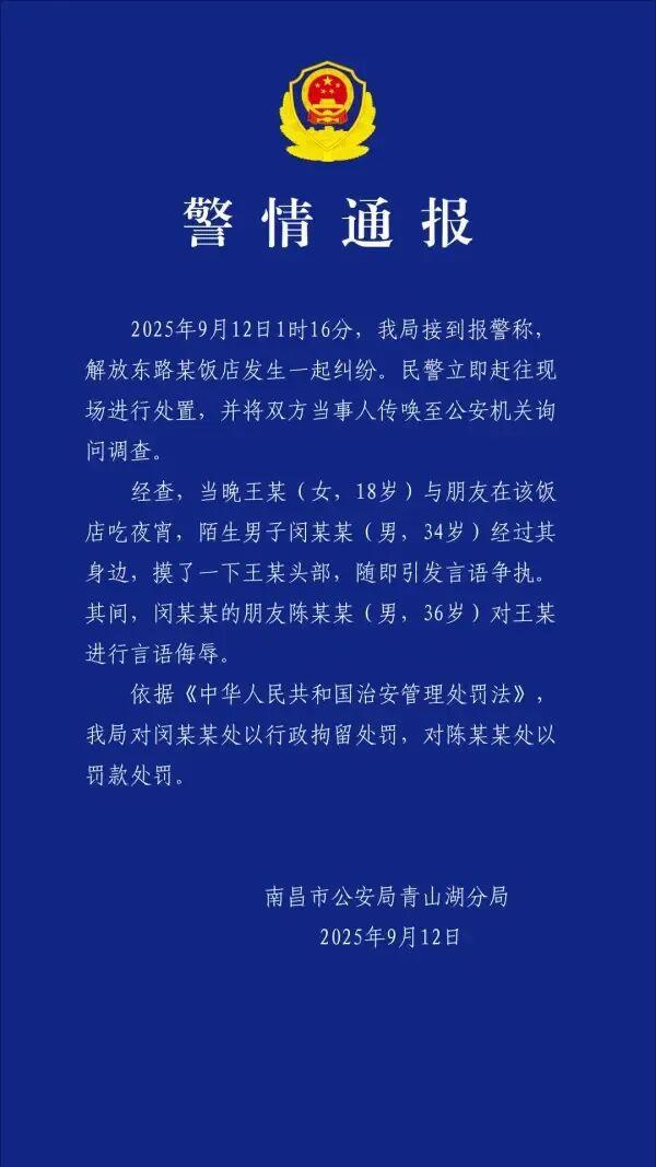 江西两女生吃夜宵遭邻桌陌生男子 " 摸头 ",要求道歉反遭其同伴辱骂,警方回应