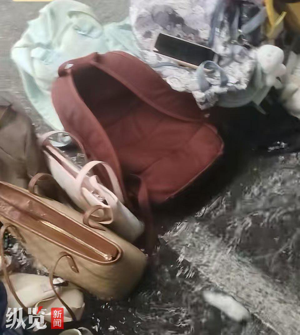 考生背包等物品放置在存放点地上被雨水冲刷、浸泡。(来源 / 视频截图)