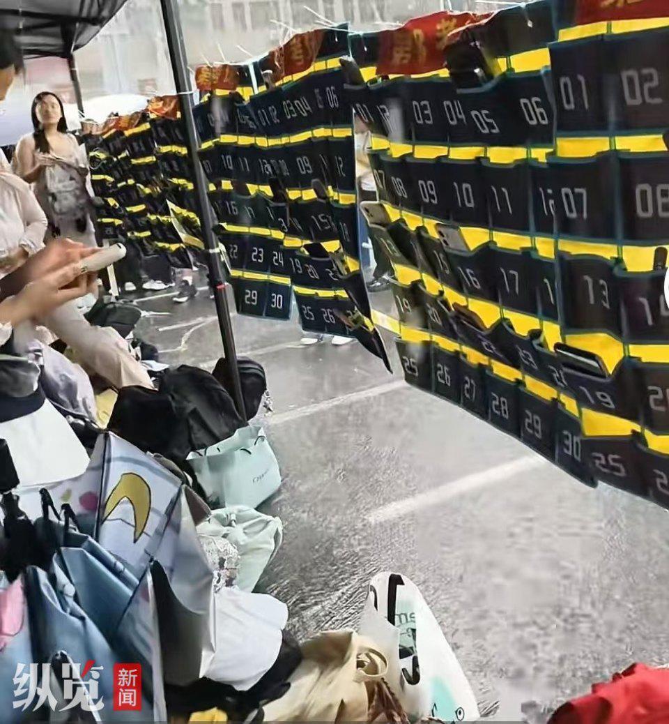 " 我两名舍友的电子产品均出现了不同程度的损坏,书包内的资料也‘泡汤’了。" 就读于大三的小李(化姓)说,发现下雨后,她曾跟门口的老师进行了沟通,希望能将物品放在考场的外面。沟通无果后,她不得不在学校门口就近找了个屋檐,把自己的书包放了过去,手机才得以 " 幸免于难 "," 存放点有摄像头,我放书包的地方没有,非常不安全,万一被人拿走,可能就找不回来了。"