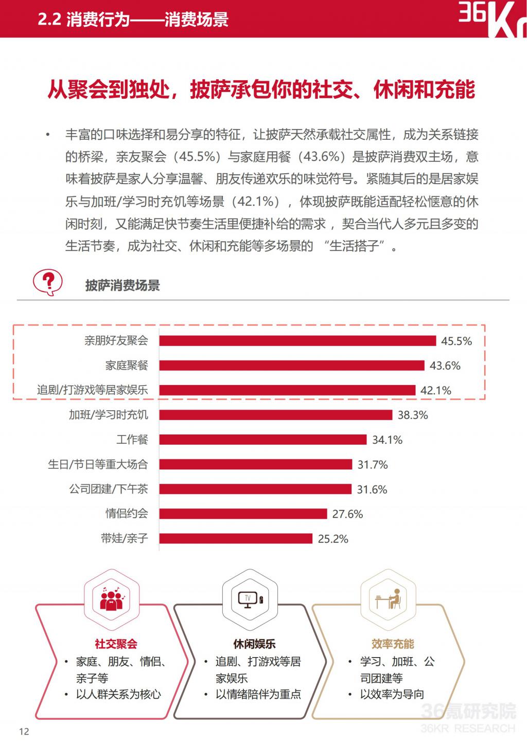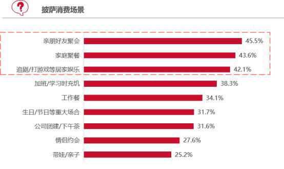 丰富的口味选择和易分享的特征,让披萨天然具备社交属性,成为关系链接的桥梁,亲友聚会(45.5%)与家庭用餐(43.6%)成为披萨消费双主场,意味着披萨是家人分享温馨、朋友传递欢乐的味觉符号。紧随其后的是居家娱乐与加班 / 学习时充饥等场景(42.1%),体现披萨既能适配轻松惬意的休闲时刻,也能满足快节奏生活里便捷补给的需求,契合当代人多元且多变的生活节奏,成为社交、休闲和充能等多场景的 " 生活搭子 "。
