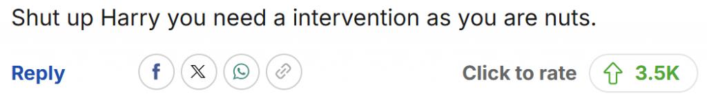 很显然,虽然哈里觉得自己主动破冰修复关系,这事儿马上就过去了,但英国民众还是觉得堵了一口气,这番发言一出口就被逮着好一顿骂: