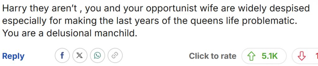 " 得了吧哈里,没人站在你这边。你和你那个只会投机的妻子广受鄙夷,尤其是你俩让女王的晚年生活陷入困境。