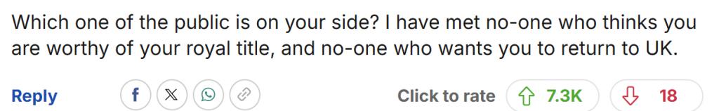 " 不是,民众中究竟谁站在你这边啊?我这辈子都没遇到过觉得你配得上皇室头衔的人,也没见有任何人希望你重返英国啊。"