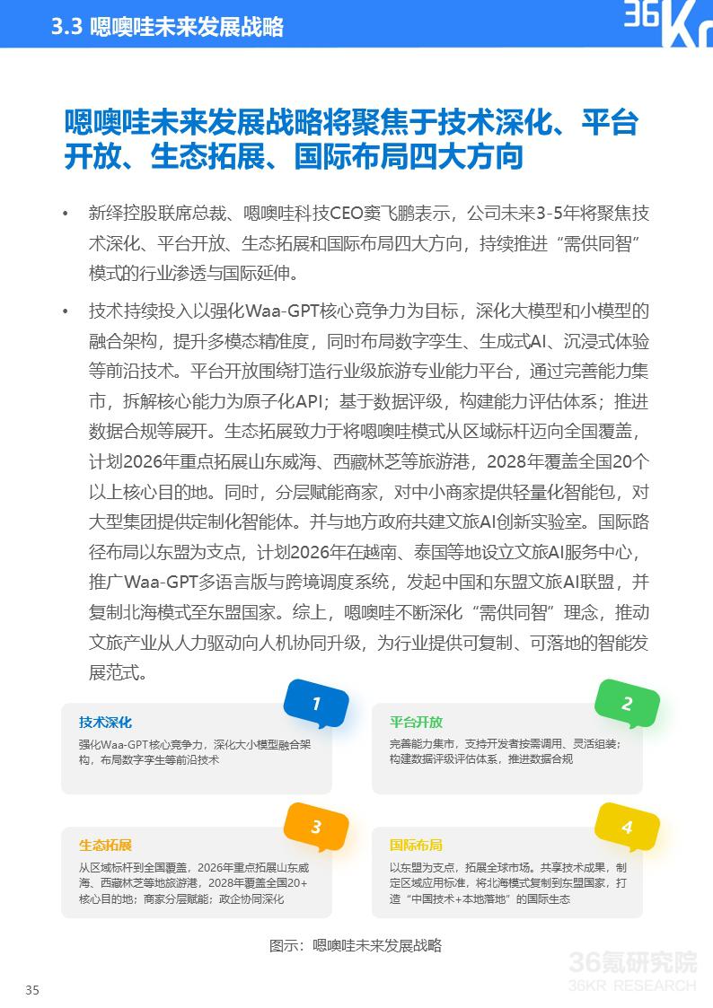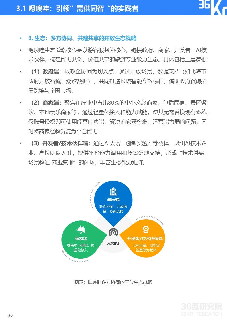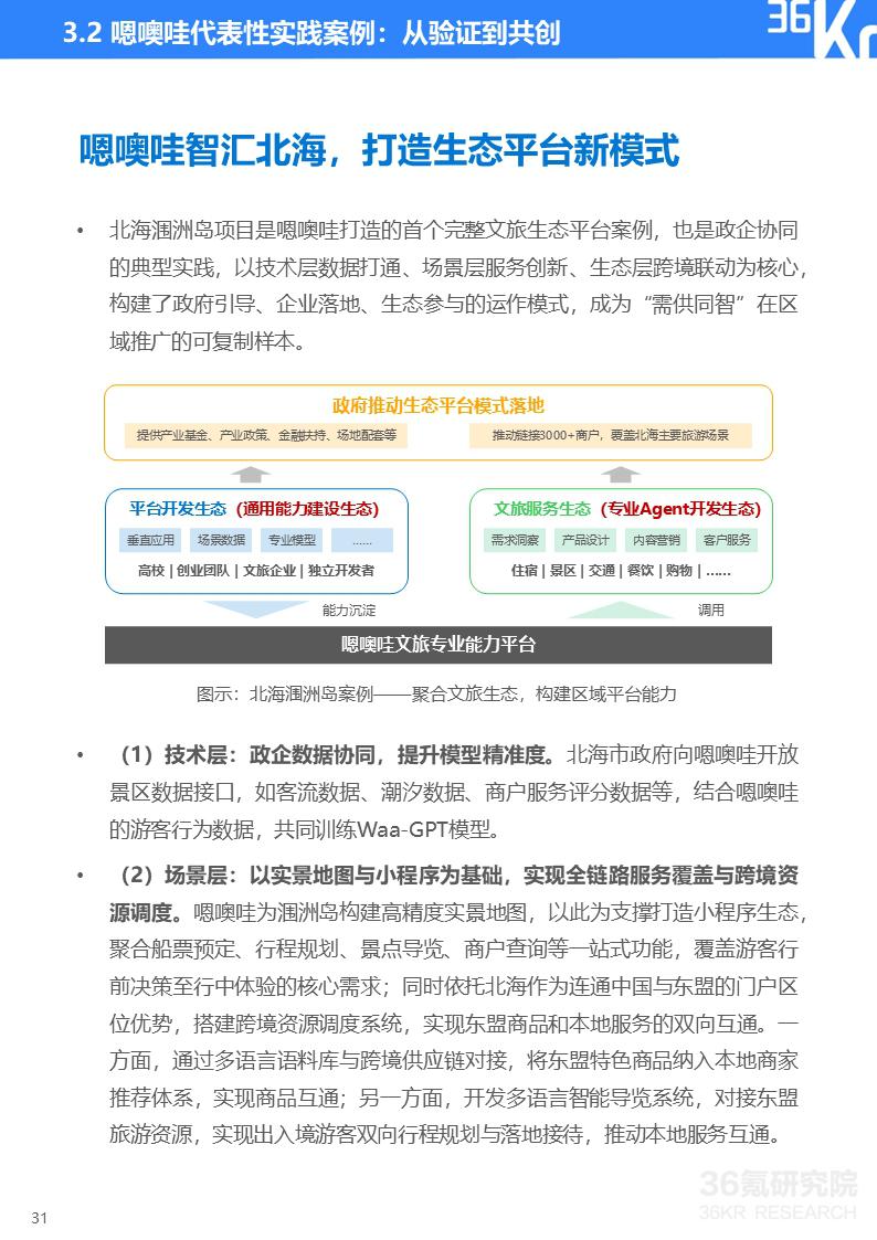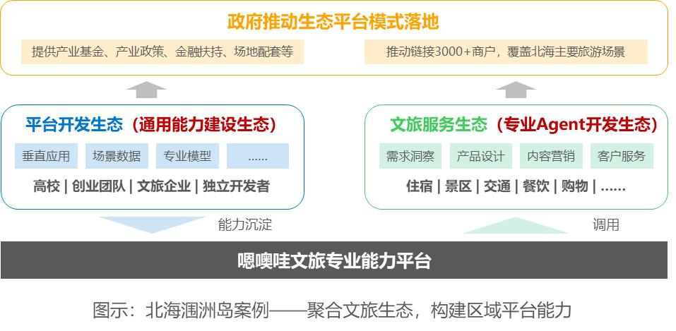 当前,AI 技术正逐步突破在文旅行业单一场景、孤立应用的初级阶段,加速向平台化、生态化的方向演进。通过构建数据驱动、开放协同的 AI 文旅平台,有效整合政府宏观数据、商家经营数据、游客行为数据等多维度数据,推动产业全链路效率提升与体验升级。嗯噢哇立足这一趋势,构建 " 平台 + 产品 + 生态 " 三位一体架构,以技术平台为根基、场景产品为载体、开放生态为延伸,聚合 AI 原子化能力,将技术模块转化为可灵活调用的资源,与文旅行业生态伙伴共用、共建、共享,有效打破技术壁垒与数据孤岛,推动全行业实现智能协同发展。例如,北海涠洲岛项目是嗯噢哇打造的首个完整文旅生态平台案例,也是政企协同的典型实践,以技术层数据打通、场景层服务创新、生态层跨境联动为核心,构建了政府引导、企业落地、生态参与的运作模式,成为 " 需供同智 " 在区域推广的可复制样本。