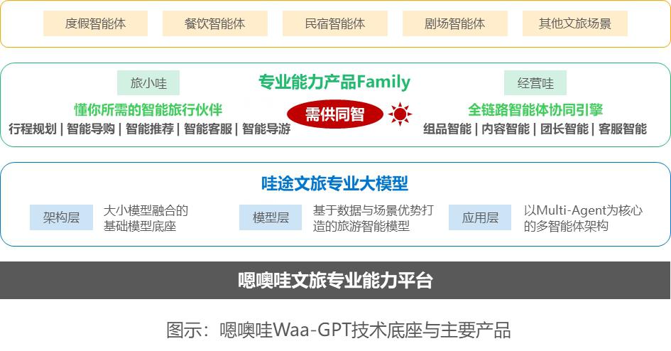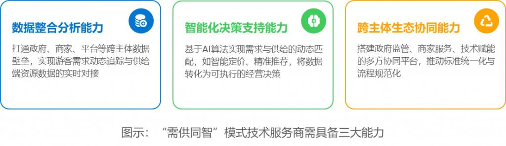 文旅产业痛点的根源之一在于传统的需求分析模式往往从供给侧出发,也就是从供到需的模式,而忽略了游客需求所具有的动态化、个性化特征,最终导致了 " 需供错配 " 的局面。由嗯噢哇首创的 " 需供同智 " 模式从需求端出发,借助智能化技术,实现需求侧与供给侧的协同进化,构建起需求精准感知、供给智能响应的闭环体系。其本质是以大模型等人工智能技术为核心驱动力,实现需求侧精准洞察与供给侧灵活响应的双向协同、动态匹配以及迭代优化。" 需供同智 " 模式的落地实施,依赖于具备数据整合分析能力、智能化决策支持能力、跨主体生态协同能力的技术服务商。