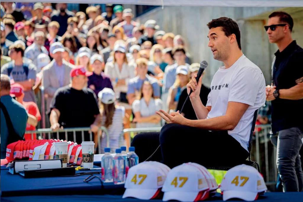▲ 9 月 10 日,美国犹他州奥勒姆市,查理 · 柯克在犹他山谷大学遭枪击前发表演讲(图源:新华社)