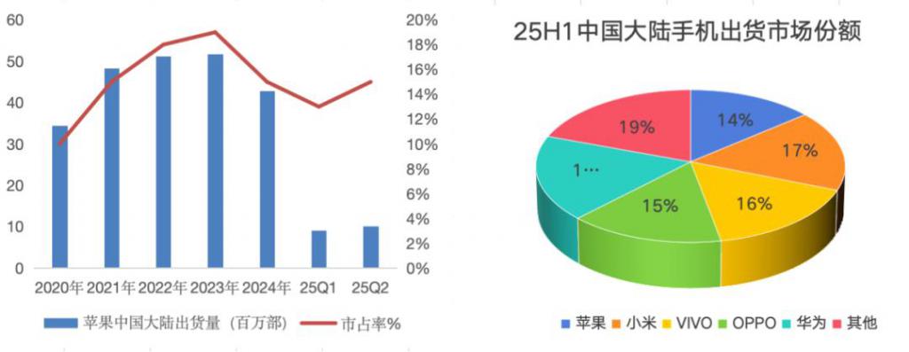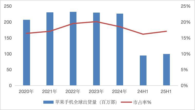 在近几年苹果盈利能力持续提升的同时,其在全球智能手机市场中的销量份额却开始不断 " 失守 "。2024 年,苹果手机全球出货市占率从 20% 降至 18%,其中,在中国的市占率更是跌出前三,降至了 15%;25 年上半年进一步沦为第五名,市占率降到了 14%。