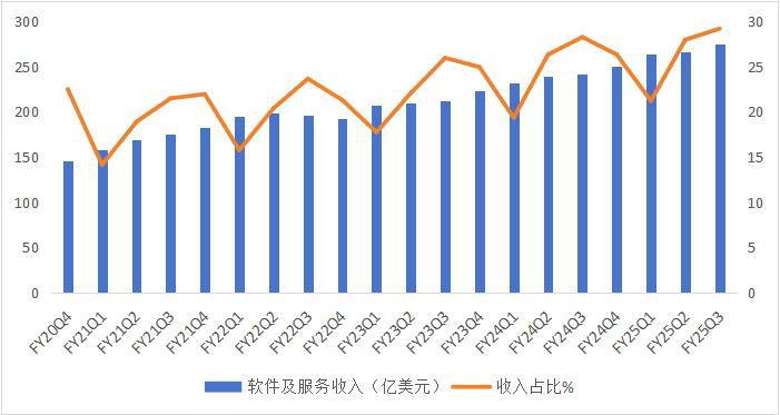 从近 5 年苹果财报披露的业务构成来看,一个不容忽视的现象是,以 ITunes 等软件为代表的服务业务收入占比逐年提升。2020 — 2024 财年,服务相关收入的营收从 538 亿美元增长至 962 亿美元,同期营收占比从 19.6% 提升至 24.6%,25 财年第三财季进一步提升至 25.6%。