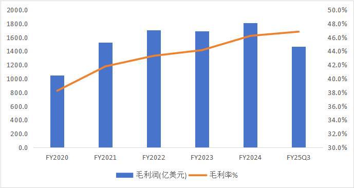 因此,苹果企图放弃部分市场份额的争夺,通过稳定的高价值量用户来维持高端品牌形象和相对较高的利润空间。这种战略的效果也非常明显,从财报数据来看,过去五年里,苹果的盈利能力逐年提升,毛利率从 2020 财年的 38.2% 一路攀升至 FY25Q3 的 46.8%。