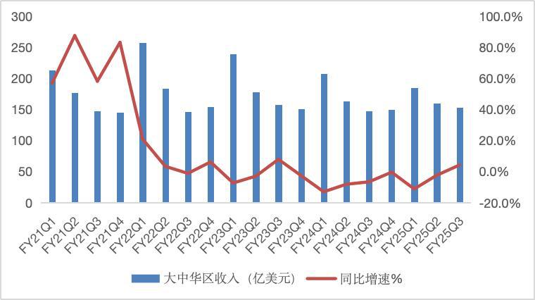 如果拉长周期,可以发现,实际上 23 年下半年开始,受出货量持续下跌的影响,苹果的大中华区收入就开始呈现负增长。截至 25 财年第二财季,苹果已经连续 7 个季度维持负增长,大中华区也成了苹果唯一持续出血的市场。