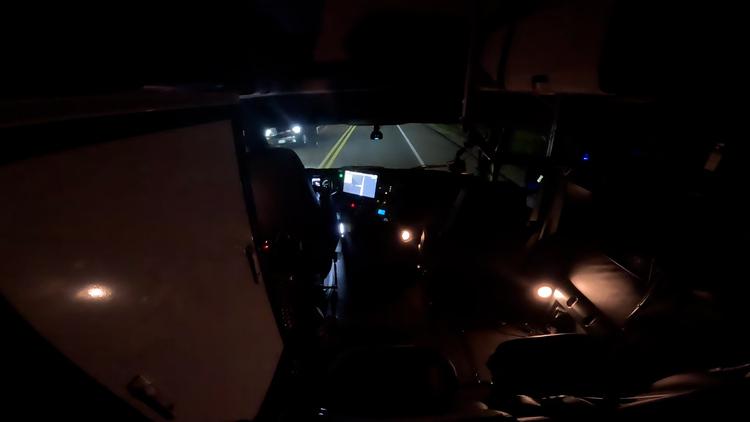 一辆空无一人的卡车,行驶在美国德州的公路上。它在黄昏时分出发,在深夜中 " 锦衣夜行 ",遇到小车礼貌避让,看到抛锚的车谨慎绕开,在不停有车加塞儿的高速上按自己想法完成并道,甚至处理了多个消防车突然出现的场景——日夜交替环境下的一切驾驶任务,都由卡车自己完成。