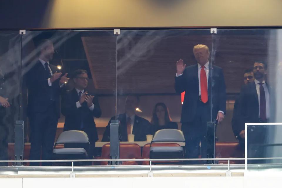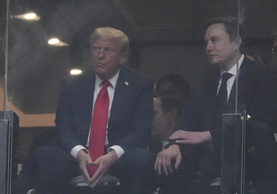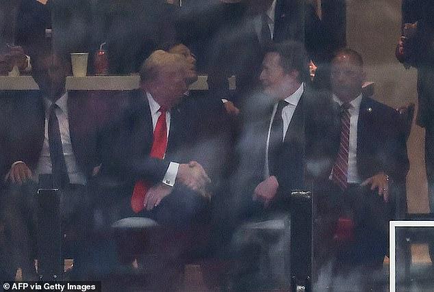 现年 79 岁的特朗普抵达体育场后就坐在了总统包厢里,马斯克是特意前往那里和特朗普见面的。
