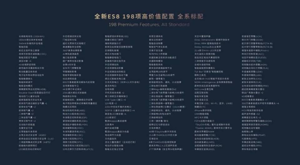 蔚来也终于懂得 " 把肉放在饭上 ",在 ES8 发布会上直接列出 198 项全系标配的配置,给人一种买到就是赚到的既视感。