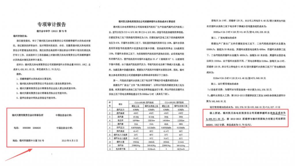 于是,德州市物价局当即委托德州天衢有限责任会计师事务所对凯元热电的有关情况进行审计。据该事务所2013年8月2日出具的《凯元热电专项审计报告》显示,经审计,"凯元热电采暖循环水供热总成本为9430911.93元,按2012-2013采暖季与恒源热力结算的805831.10吉焦计算,供热单位成本为11.7元/吉焦(如下图右红框)。"