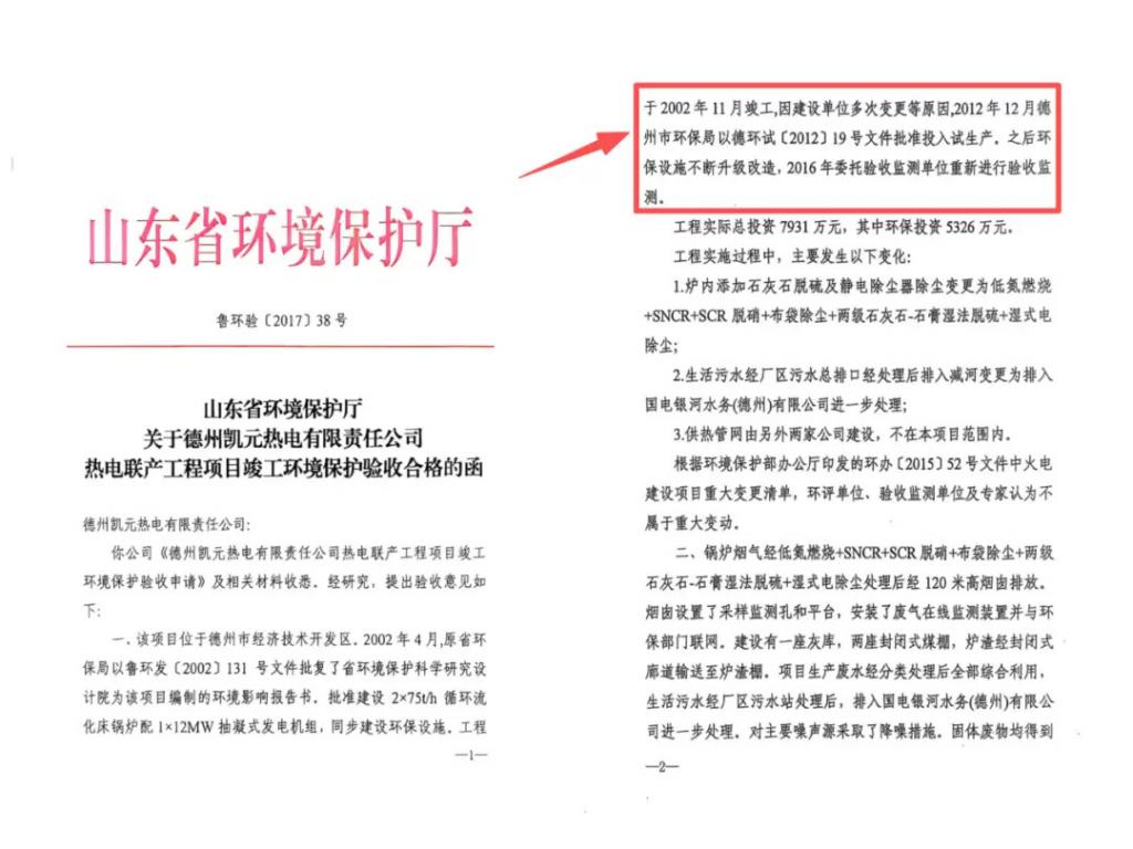大强集团接管凯元热电后,还发现电厂的环评验收及机组建设批复等手续不齐全。据原山东省环境保护厅2017年3月22日出具的《关于凯元热电公司热电联产工程项目环境保护验收合格函》显示,凯元热电于2002年11月竣工,因建设单位多次变更等原因,2012年12月德州市环保局才批准投入试生产(如下图)。这表明,凯元热电在重组前的十年里,一直未经环保部门验收批准就发电供热,属于"未批先建先产"项目。