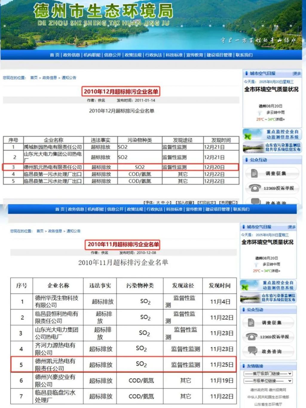 白鹿新闻还了解到,原凯元热电早前还存在严重污染环境现象。经查询德州市生态环境局官网,仅2010年一年,德州市环保局曾三次(6月2日、11月25日、12月20日)通过监督性监测发现凯元热电因违法超标排放二氧化硫(SO2)上了《超标排污企业名单》(如下图)。其间2009年11月4日,时任德州市环保局党组书记、局长吴文群曾陪同省环保厅领导到凯元热电等企业实地走访,了解企业污染治理设施及污染源在线监控设备运行情况,并与企业负责人深入交谈。