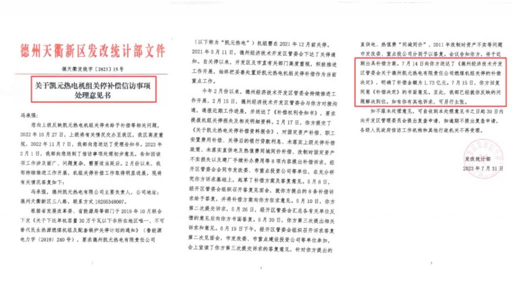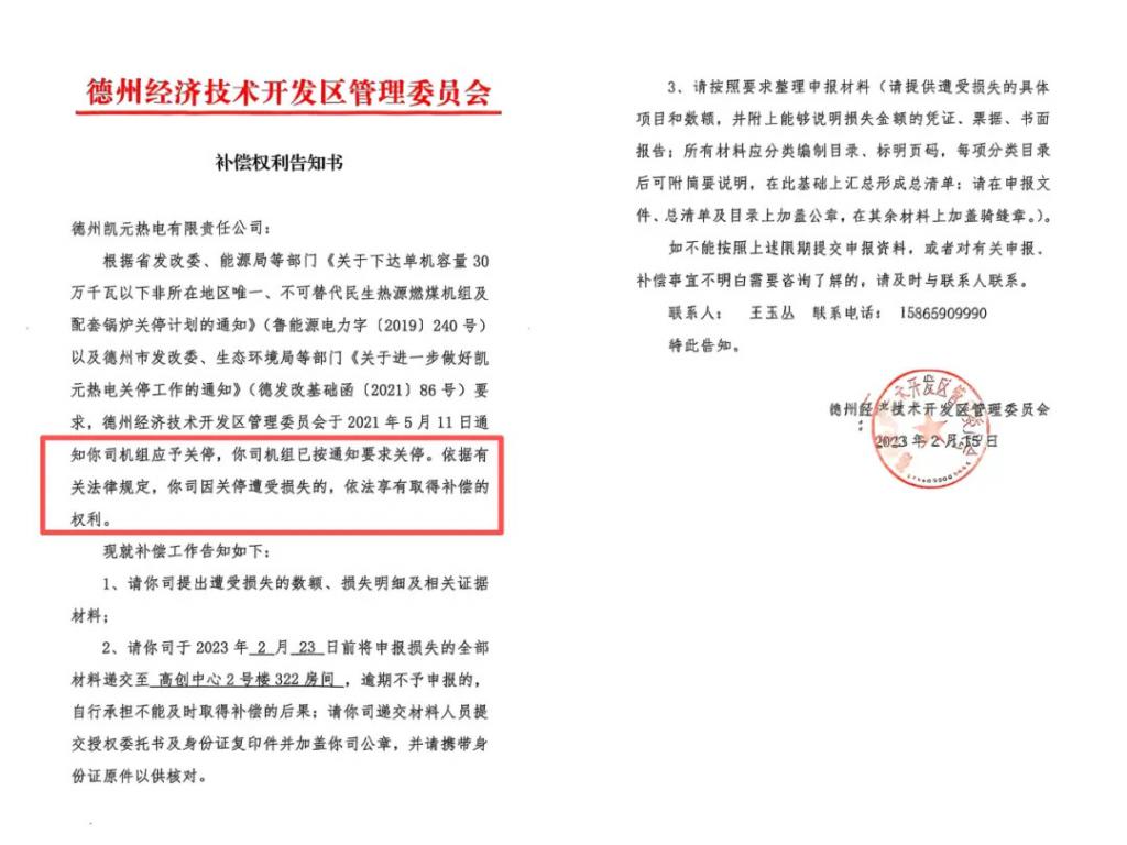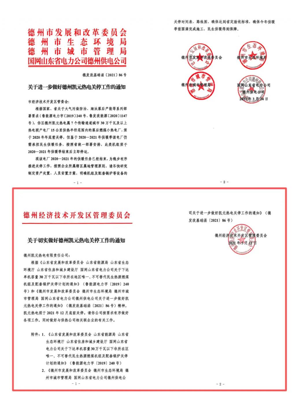 2021年5月11日,德州经开区管委会向凯元热电下达了《关于切实做好凯元热电关停工作的通知》(以下简称:《关停通知》),根据《关停通知》要求,凯元热电须于2021年12月底前关停(如下图下红框)。