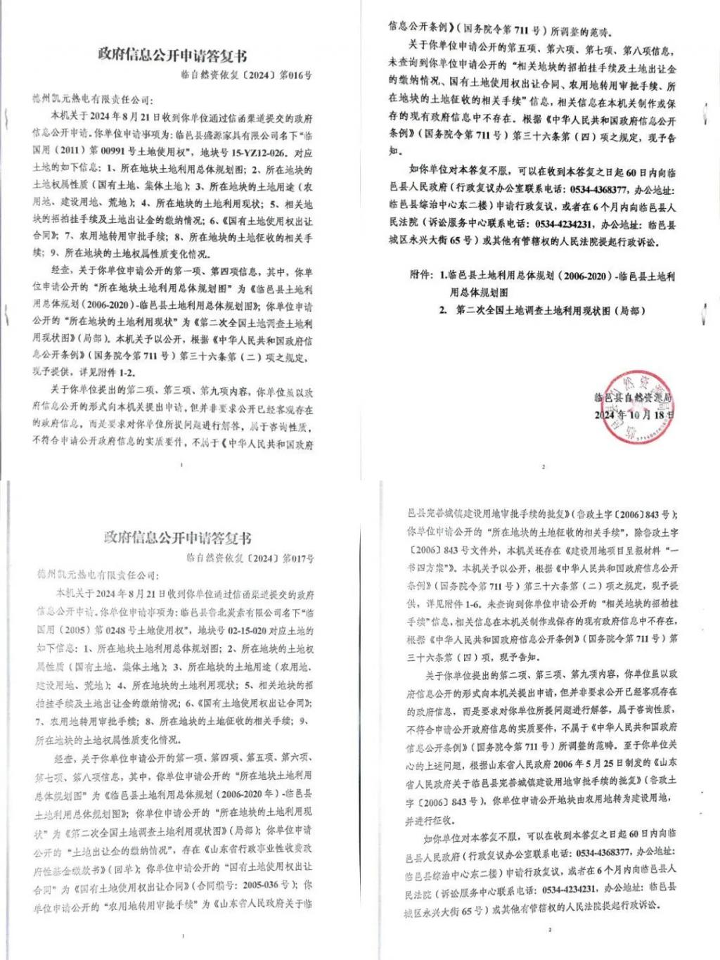 事后,冯承强为实现债权进行调查,结果发现部分债权对应的抵押土地资产合法性存疑。"经调查得知,上述三笔债权对应的抵押土地均非依法经过土地招拍挂程序取得。"冯承强称,其中最严重的属于富海农业担保方——临邑县盛源家具有限公司(以下简称"盛源家具")抵押的96亩土地和房屋,未办理任何土地及规划审批手续。为此,凯元热电向临邑县自然资源局、山东省自然资源厅提交申请,要求对三项债权对应的三块抵押土地的属性、现状、审批、招拍挂等信息进行公开。