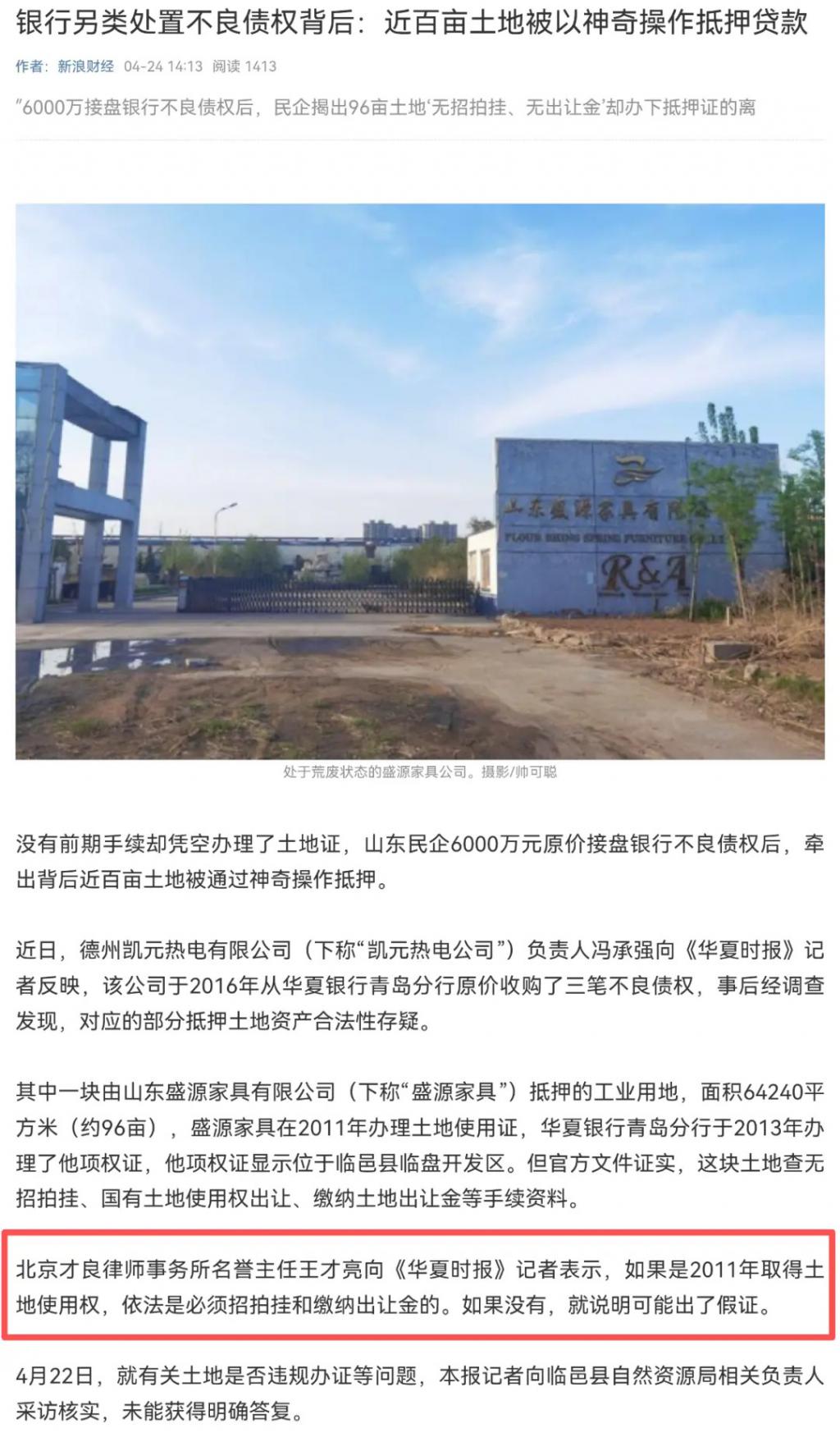 白鹿新闻援引北京航空航天大学法学院兼职教授、中国建设管理与房地产法研究中心执行主任王才亮接受华夏时报采访表示,"如果是2011年取得土地使用权,依法是必须招拍挂和缴纳出让金的。如果没有,就说明可能出了假证。"