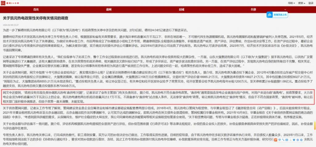 德州重投公司上述负责人曾就"政府未兑现凯元热电‘直供电’问题"接受"德州24小时"记者采访时表示,转让前,凯元热电确实有过"直购电"情况,但由于不符合国家政策,"直购电"被叫停。转让后相关部门虽积极协调推进,但由于政策一直未调整,未能实现(如下图)。