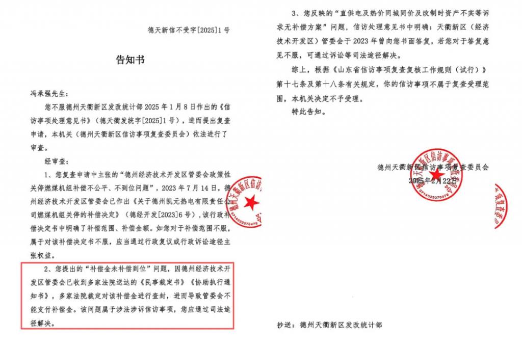 对于这笔1.73亿元补偿款不能拨付到位的原因,天衢新区信访事项复查委员会在今年2月22日发给冯承强的《告知书》写道,"因德州经开区管委会已收到多家法院送达的民事裁定书,多家法院裁定对该补偿金进行查封,进而导致管委会不能支付。""你反映的直供电及热价同城同价等诉求无补偿方案问题,你可通过诉讼等司法途径解决(如下图)。"从这个回复可以看出,德州经开区基本认同了这笔1.73亿元的预付补偿金。