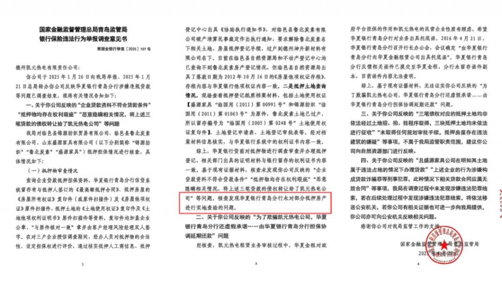 此事经媒体曝光后,备受各方关注。2025年4月29日,国家金融监督管理总局青岛监管局就相关举报问题向凯元热电作出了书面《调查意见书》,经核查发现华夏银行青岛分行未对部分抵押房产进行实地查验的问题(如下图),其中该行在对鲁北炭素的授信过程中,未对部分抵押房产进行实地查验(涉及3处房屋,所有权证号分别为"鲁临房权证城字第 37281号""鲁临房权证城字第 37282号""鲁临房权证城字第 37278号")。