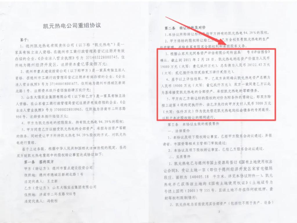 冯承强称,签订重组协议时,为配合政府尽快进行产权挂牌,基于对市政府和发改委的充分信任,大强集团在未正式交接的情况下配合在评估报告上盖章,可接管后却发现很多对外债权无法收回,固定资产也不实。为此,德州重投公司根据重组协议要求提前将凯元热电的100%股权转让给了大强集团。企查查显示,2012年8月23日,凯元热电的100%股权由原德州重投公司变更为大强集团。