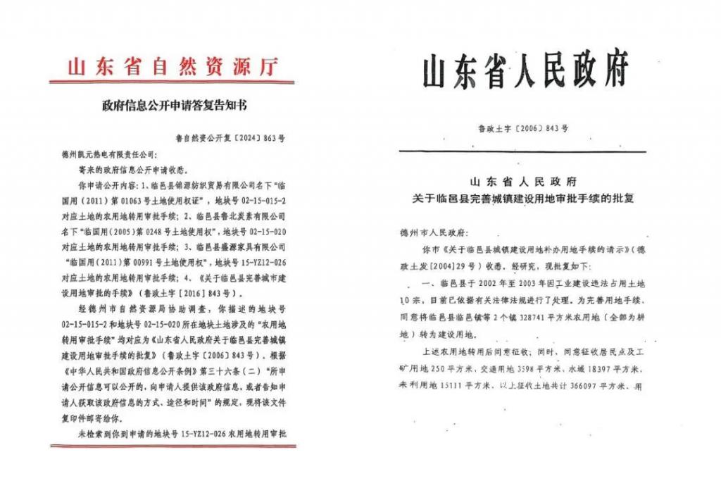 2024年9月14日,山东省自然资源厅作出的一份答复告知书及附件显示,经德州市自然资源局协助调查,锦源纺织和鲁北炭素抵押土地涉及的"农用地转用审批手续" 均对应为《山东省人民政府关于临邑县完善城镇建设用地审批手续的批复》(鲁政土字〔2006〕843号),两块土地早先都是工业建设违法占地,2006年5月经该批复获准由耕地转为建设用地(如下图)。而盛源家具抵押的土地,则查不到农用地转用审批手续。