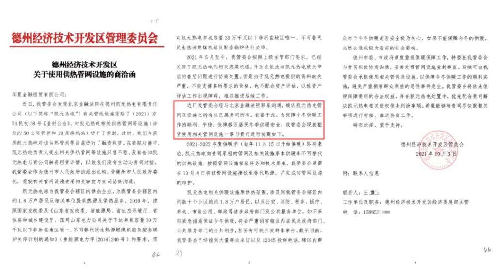 德州经开区凯元热电关停工作专班负责人曾就此回应当地媒体,凯元热电的供热管网是区管委会从上述华夏金租手中租用过来的,因为其管网经营权归华夏金租所有。据经开区管委会2021年10月3日给华夏金租出具的《关于使用供热管网设施的商洽函》显示,近日我管委会经与北京金融法院联系沟通,确认凯元热电管网及设施之所有权已属贵司所有,现就租赁相关管网设施一事与贵公司协商承租凯元热电供热管网及设施接驳至替代热源,以保障全区数十个小区约1.8万户居民今冬供暖安全,避免严重损害群众利益的恶性事件发生(如下图)。当月,华夏金租就此函给经开区管委会回函称,"考虑到居民供暖的需求,从保障民生、维护社会稳定的大局出发,我公司同意将前述供暖管网等相关设施租赁给管委会使用。"