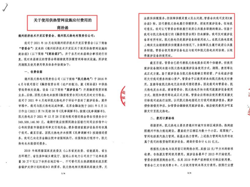 "我们已收到华夏金租商洽函两年多时间,由于三方至今仍未达成供热管网租赁协议,导致恒益热力无偿占据凯元热电供热管网四年分文未支付费用。"冯承强表示,为此,凯元热电最近将恒益热力诉至法院,目前德州经济技术开发区人民法院已受理此案。但官方通过当地媒体解释,凯元热电关停工作专班与华夏金租多次磋商,正在积极细化具体方案,有序推进实施。
