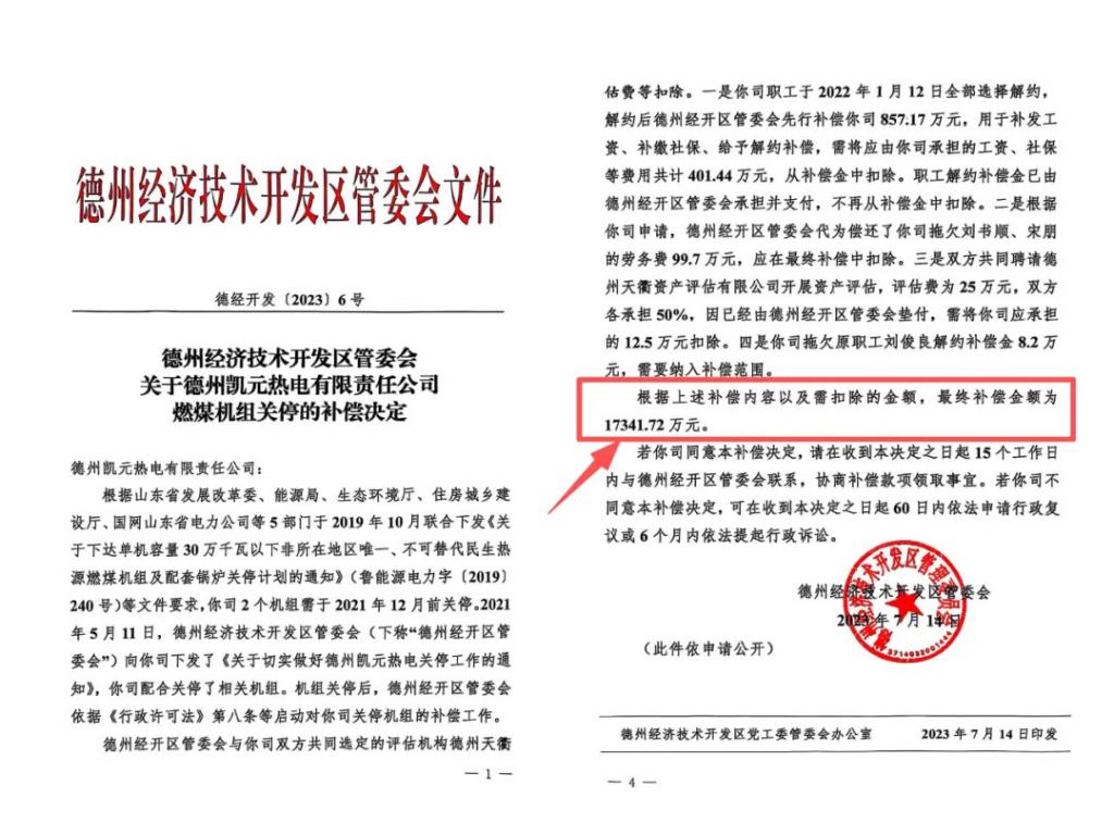 冯承强说,他本以为事情到此应该告一段落,凯元热电也等着政府补偿款偿还银行贷款。然而不到一个月,该评估报告经德州经开区管委会集体讨论审核未获通过,并于同年7月14日作出了《关于凯元热电燃煤机组关停的补偿决定》(以下简称《补偿决定》)。