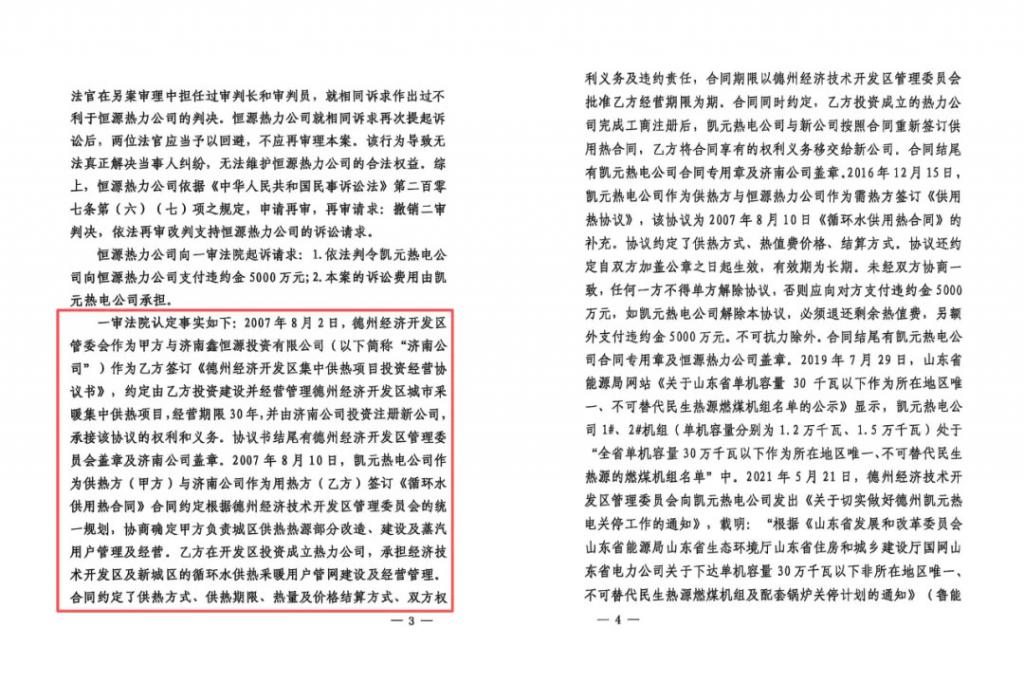 上述民事判决书载明,根据凯元热电初步统计,2011年至2021年(10年)供暖期间,恒源热力使用凯元热电设备、管网共计供热量为8286175.96吉焦,按照同城同价原则,实际结算单价与同城同价差额18元/吉焦计算,应补偿金额149151167.28元。也就是说,凯元热电在"直供热"这一项,十年来又损失了近1.5亿元。